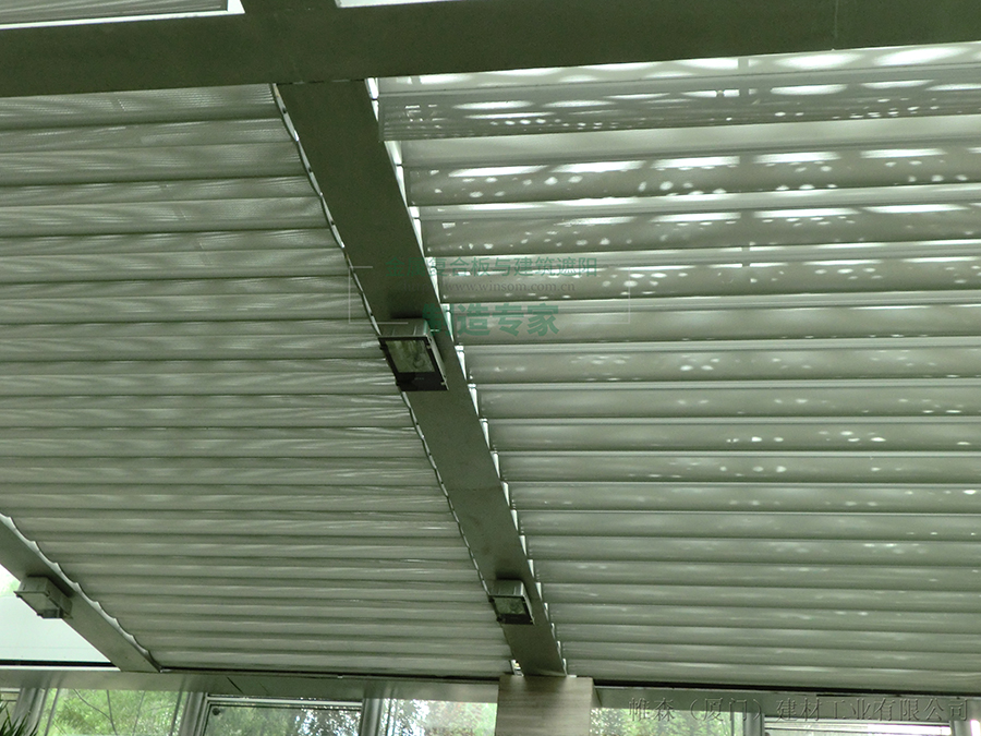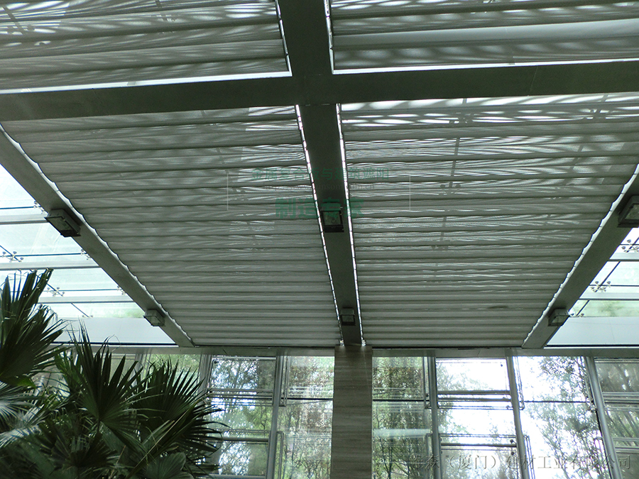 帷森PS-D400A通透型遮阳百叶便安装于意华东贸会所热带植物区阳光顶部位。阳光穿过通透型遮阳百叶上独特的小孔,在热带植被上留下星星点点的光影,构成一幅清新自然而美妙的画面。经遮阳百叶柔化后的太阳光,温暖却不耀眼,置身其中也让人倍感舒适。
