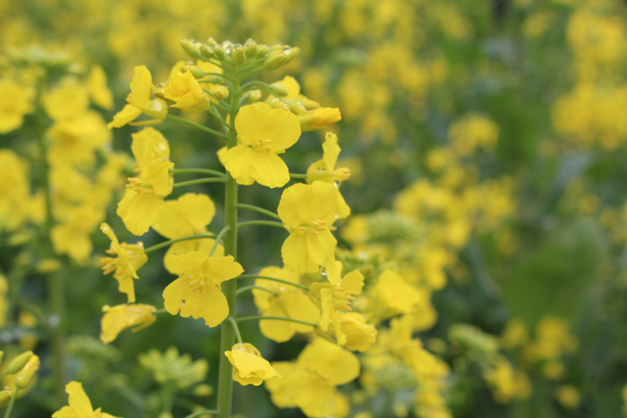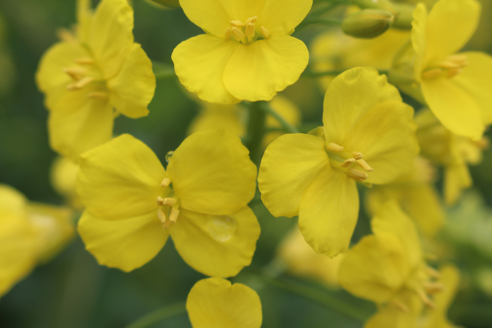 油菜花四片花瓣,整齐地围绕着花蕊,朴实个性。花瓣十分精致,有细细的纹路;