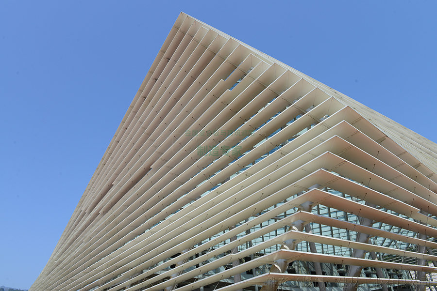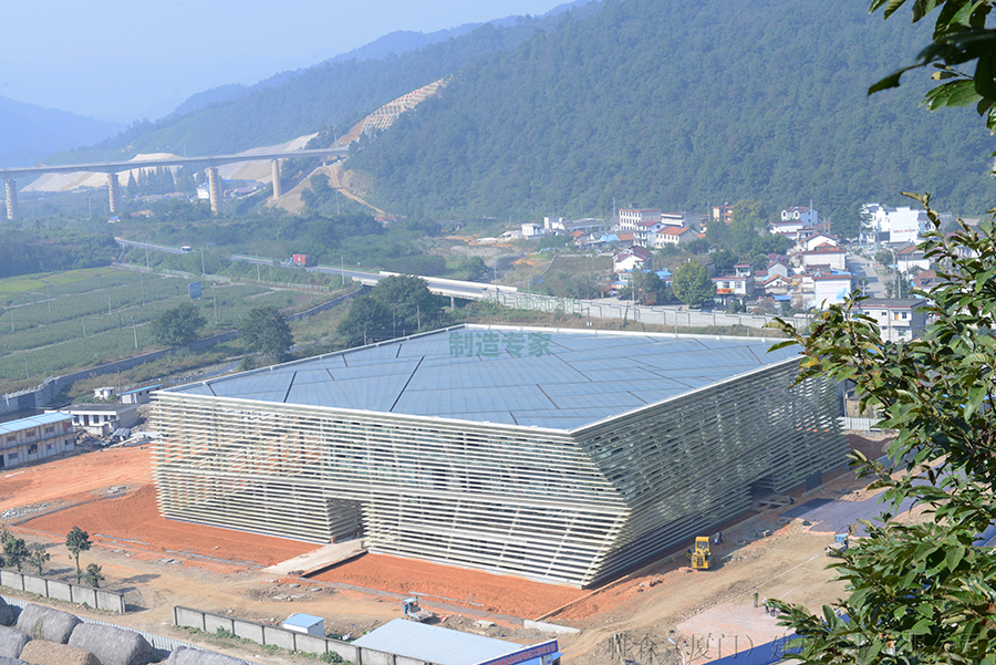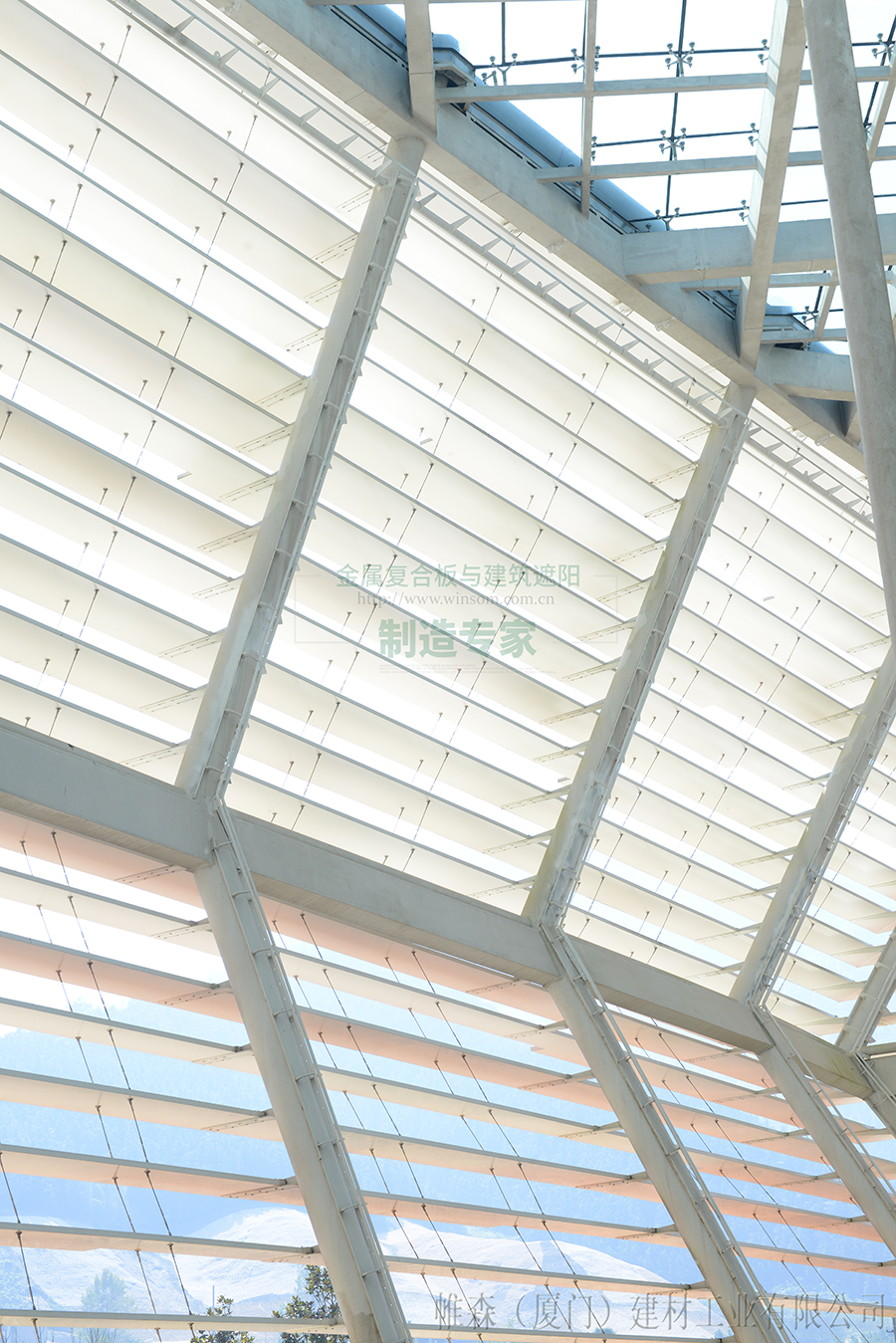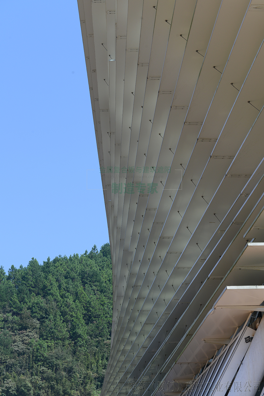 该项目使用的蜂窝板并非用于墙体的立面装饰,而是将蜂窝板悬挂于玻璃幕墙外,水平层叠,营造出摊开的宣纸状,从远处看就像是一撂已经完成的宣纸叠放于秀丽山河间,建筑宏伟大气且饱含浓郁的文化底蕴。为了实现建筑物宣纸造型的奇特效果,蜂窝板必须尽可能连续,减少接缝,还必须充分考虑板材的挠度。为此,帷森为其研制出FIC50S特殊蜂窝板,最大跨度可达9.5m长,板材厚度为50mm。为了避免大规格的板材出现下弯的情况,帷森在每片板材内部都放置有一定厚度的型材,以保证板材能够持久保持极佳的平整度及安装强度。