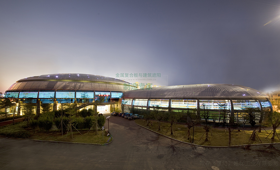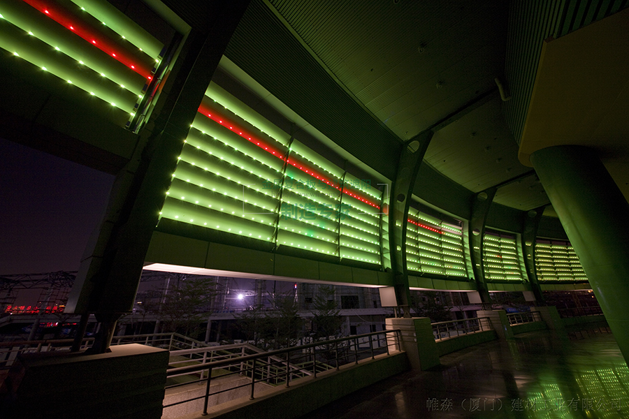 帷森SS456F遮阳百叶安装于综合馆及门球国圆形外立面上,是国内内首创遮阳与夜景相结合的项目。设计师想要用灯带来达到夜景的效果,但是灯带无法固定,而且在白天不需要夜景的时候,灯带悬挂在建筑外墙会影响美观。帷森首创将LED灯内嵌在遮阳百叶内,并且采用隐龙骨设计的百叶安装系统,既解决了灯带影响美观的问题又实现了遮阳功能与完美的夜景效果。