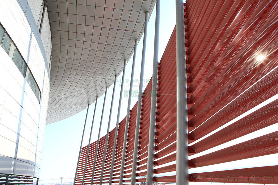 自行车馆是一座巨大的圆柱型建筑,简洁利落的金属幕墙外采用斜向的金属构件及条形排布的遮阳百叶加以点缀,使整个场馆更具动感,宛如飞速旋转的车轮,突出了自行车运动的主题特征。帷森PS-D300F通透型遮阳百叶镶嵌于斜向金属构件之间,火红的色彩为整个场馆增添了一份暖意与生气,也将更快更高更强的体育精神得以融汇其中。阳光透过遮阳百叶,在金属幕墙上铺洒出一片斑驳的光影,为体育馆涂抹上一份自然的装饰,也为场馆内营造出舒适柔和的环境空间。梭形结构的的PS-D300F通透型遮阳百叶采用独特的百叶穿孔工艺,不同的安装角度可折射出不同光景,呈现出不同的韵味。