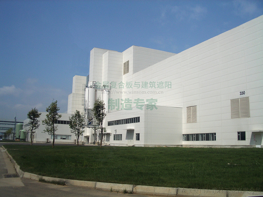 长春一汽大众奥迪总装厂房项目照片,帷森三明治板从08年安装使用至今无任何的鼓包及色差现象。