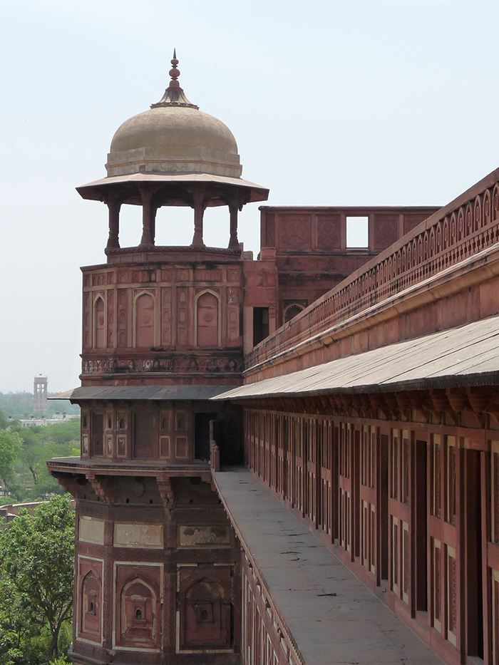 阿格拉红堡内有一座八角形的石塔小楼,登临塔顶,极目远眺,可以看到举世闻名的泰姬陵。根据解说,当年沙?贾汗国王被其第三子软禁在这座古堡时,经常默默地坐在小楼中,怀着无限的思念之情望着泰姬陵,似乎在倾诉他那一颗孤寂哀伤的心。