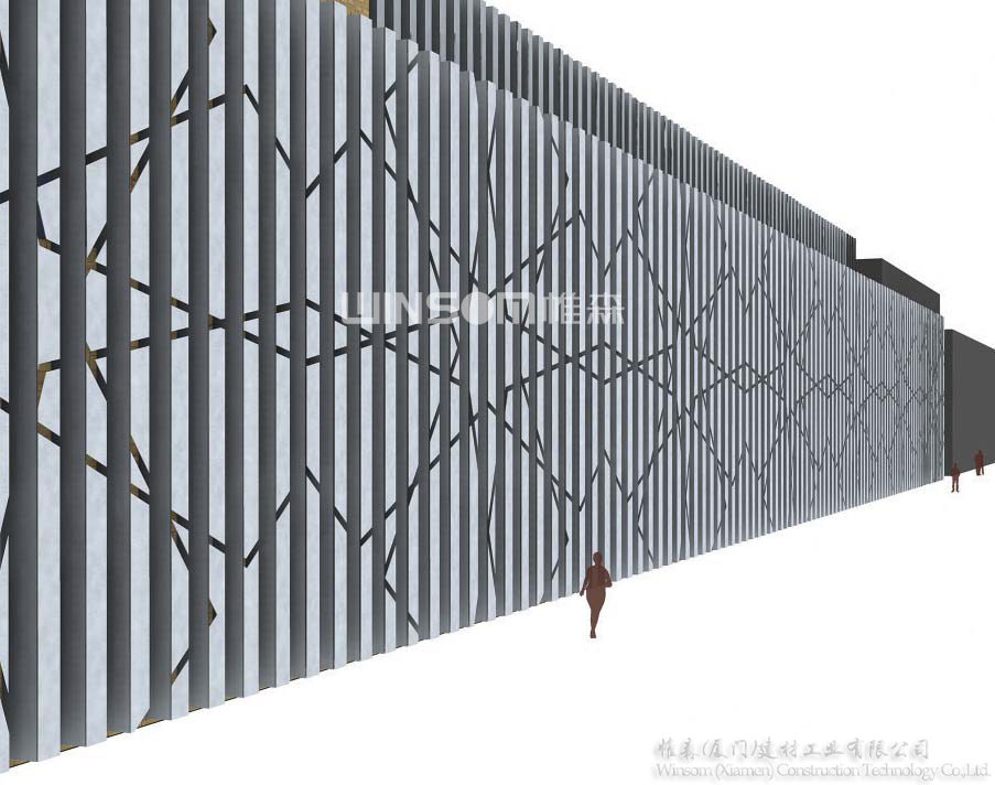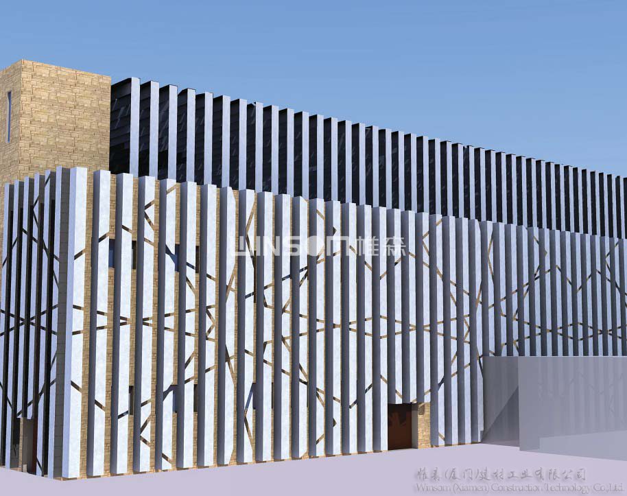 Winsom R&D team specially explored integrated L shaped aluminum perforated sun louver profiles according to the architect’s designation. The profiles are regularly drilled and notched into geometrical figure by CNC automobile technique, orderly arranged in the facade of building. It outlines geometrical figure with metal rhythm and increases a touch of vital and beauty scene for whole building.