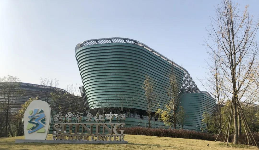 与博物馆外观形似的展览馆,其幕墙采用三明治一体板。为了实现山水纹路,层层涟漪形态效果,该项目上大面积选用量身定制的平板、弧形板、扇形板以及开启扇等多种造型板材。